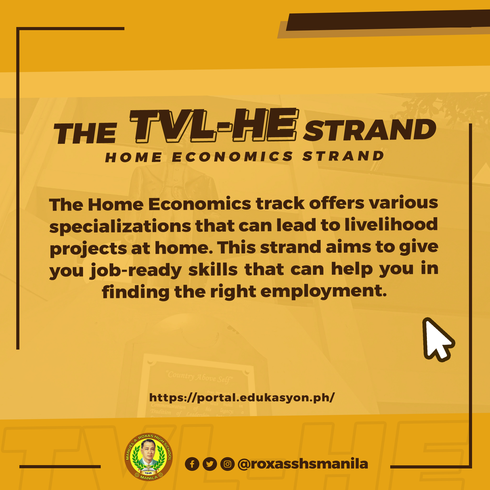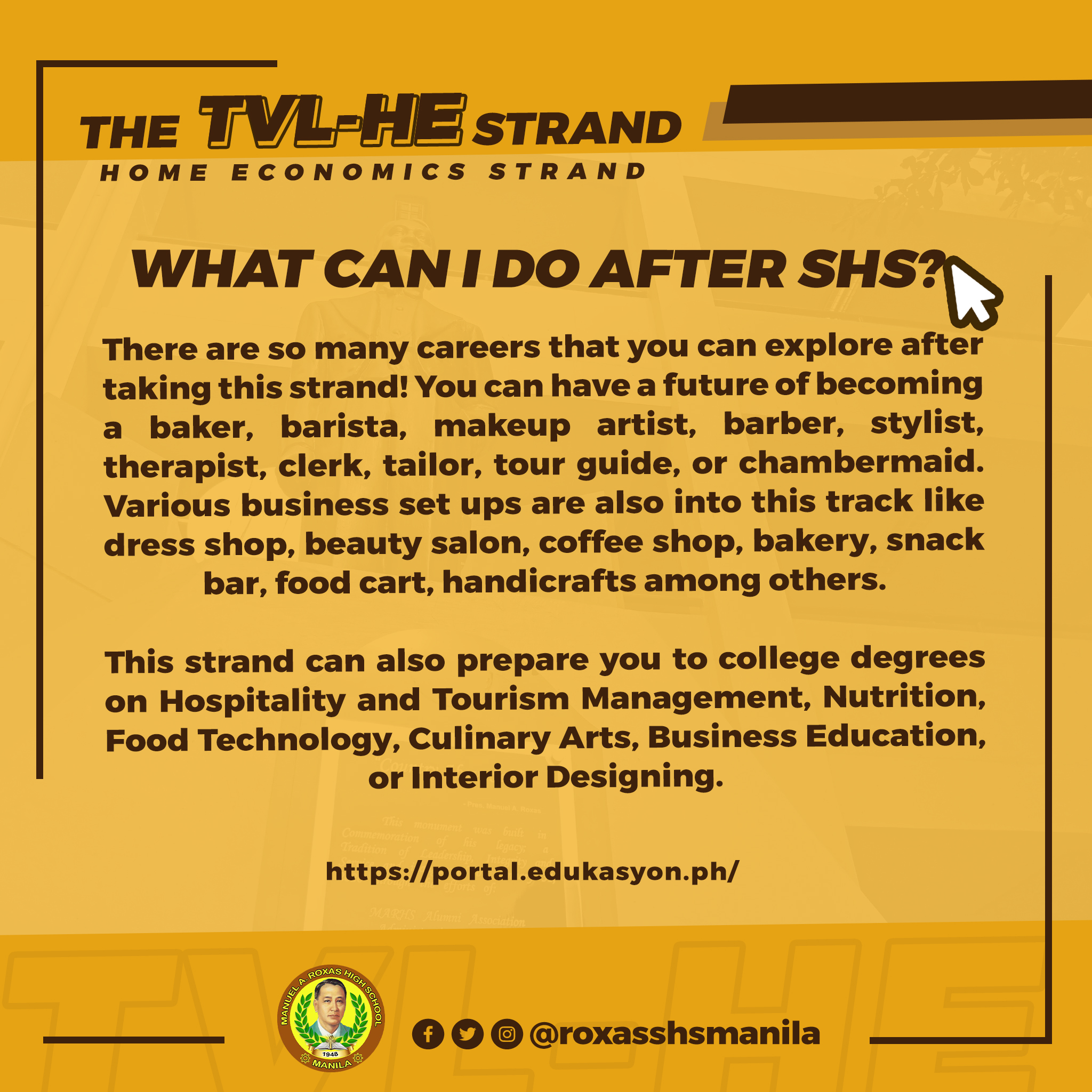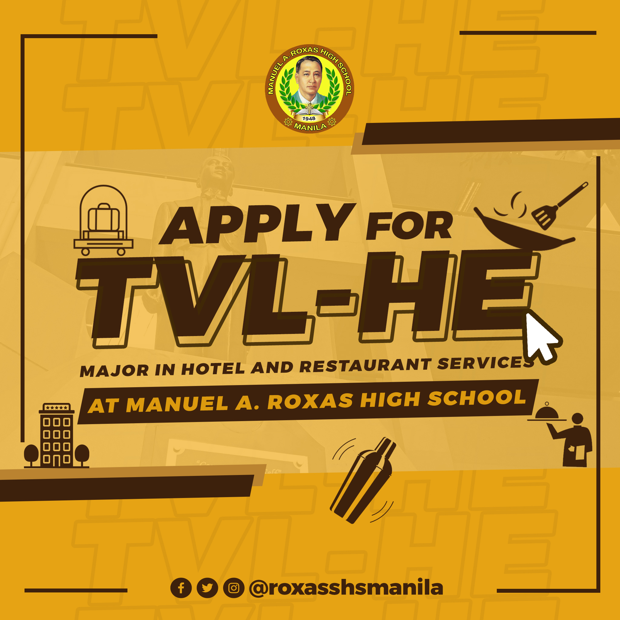 Does anything related to hotel and restaurant services intrigue you? Looking for an SHS strand inclined to that? Worry not, because Manuel A. Roxas Senior High School offers you TVL-HE strand Major in Hotel and Restaurant Services! The TVL-HE Major in HRS trains students with competencies that focus on the key aspects of its industry. Such competencies are food and beverage service; food service management; customer service; industry awareness; and a lot more. The essential knowledge and career skills acquired in studying this strand are needed in either pursuing your college degree or starting your own business or even be employed—backed by TESDA certifications—shortly after graduation. The choice is yours to make!