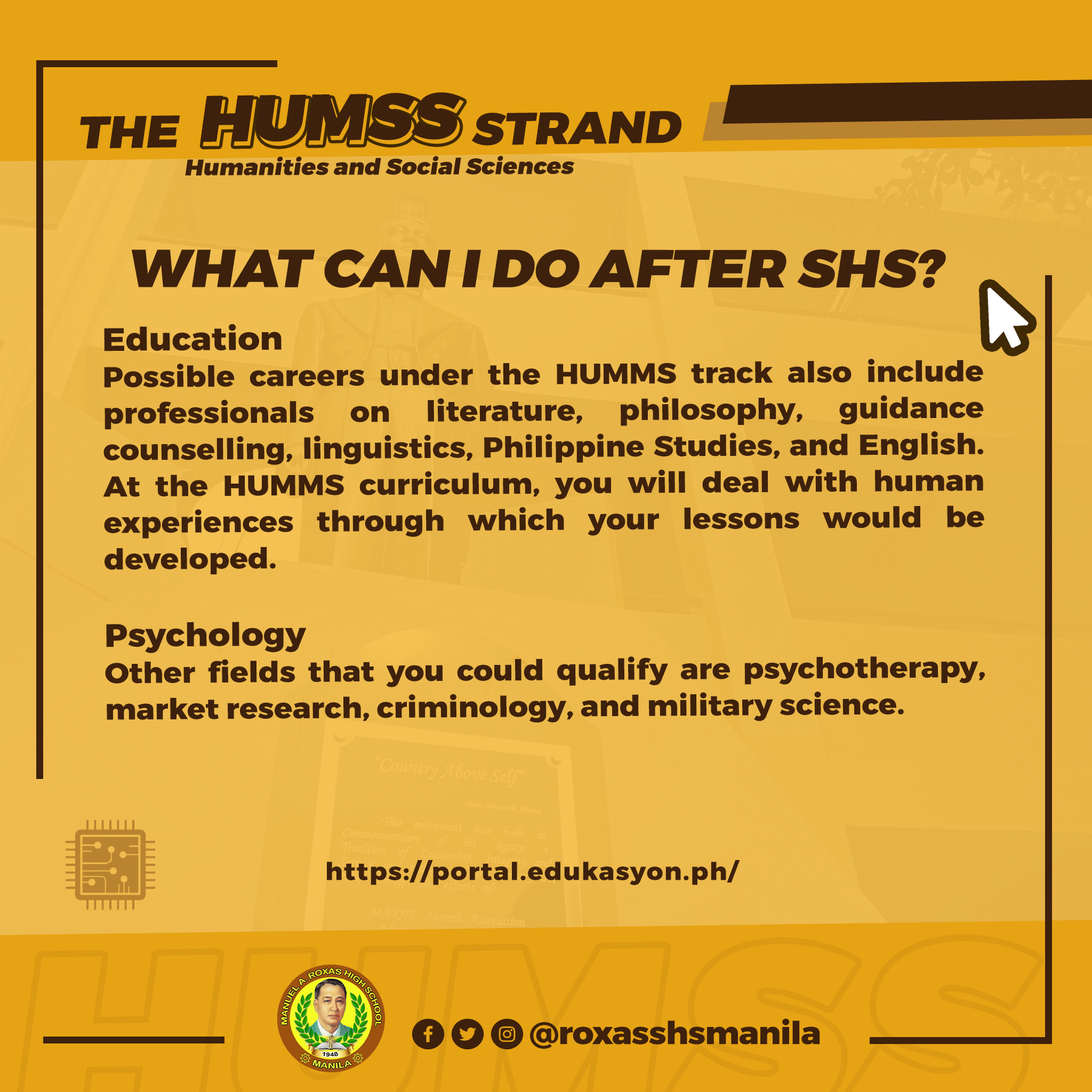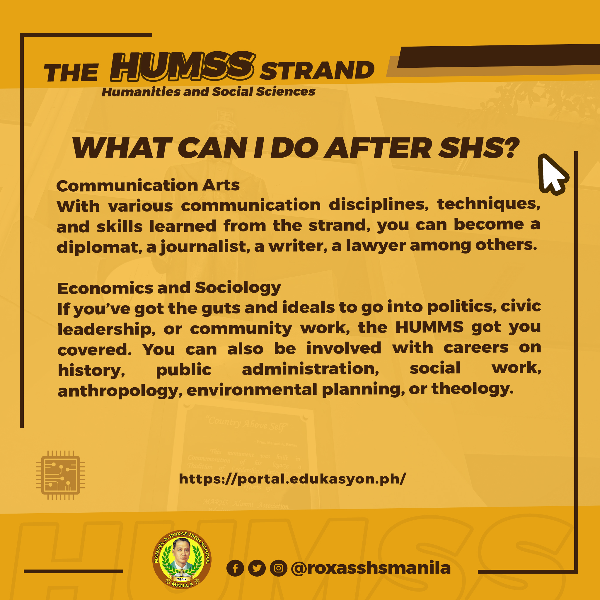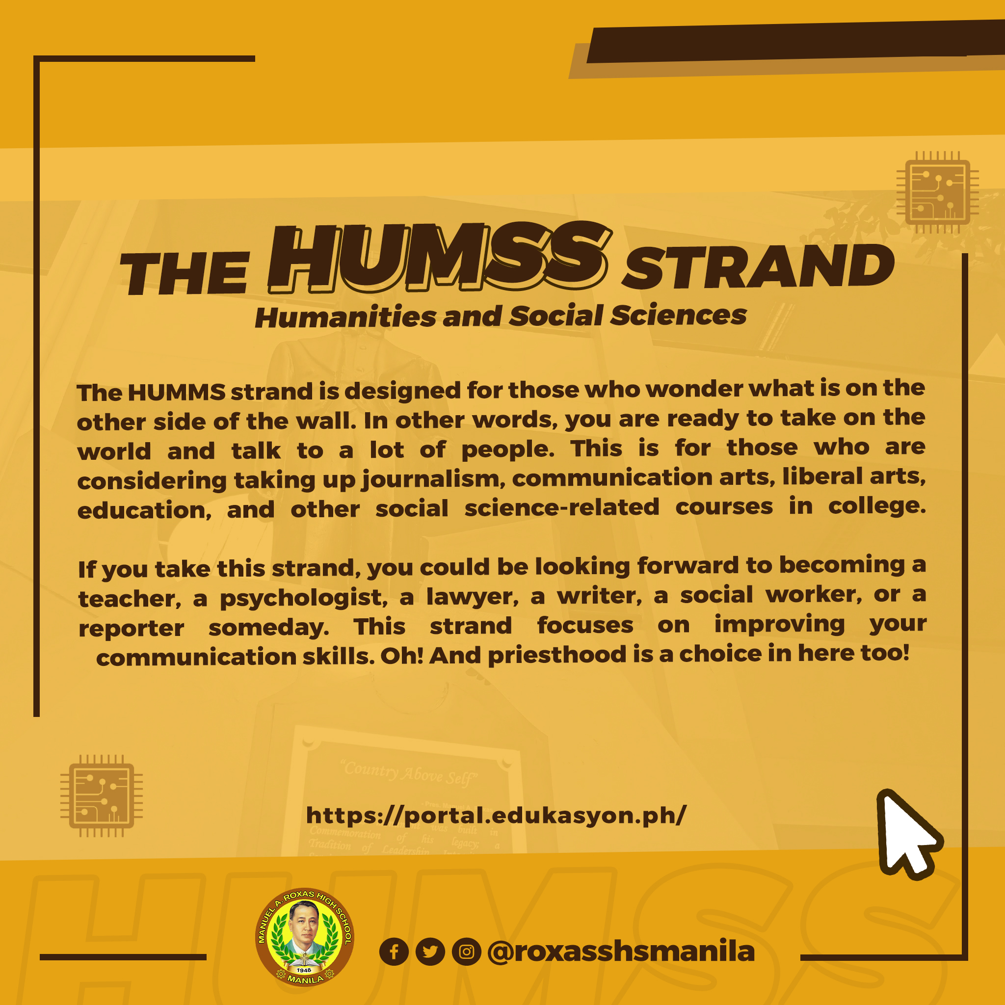 Are you fond of writing? Reading? Justifying claims using valid grounds, hence, critical thinking? HUMSS strand got you covered! The acronym HUMSS stands for Humanities and Social Sciences. Unlike other strands, the HUMSS strand encompasses a broad range of disciplines that dive into the examination and inquiry that utilizes experimental, scientific, and basic techniques for studying behavior and societal changes. This strand enhances students' reading, writing, social, reasoning, and speaking skills; and other fundamental skills needed in taking social-science courses and the like in college. Thus, it's a good training ground for students to improve their self-esteem and be socio-political aware individuals. Someone could bring positive change to our society by studying social science theories and concepts, and that someone could be you! Serve the People and be a #Humanista!