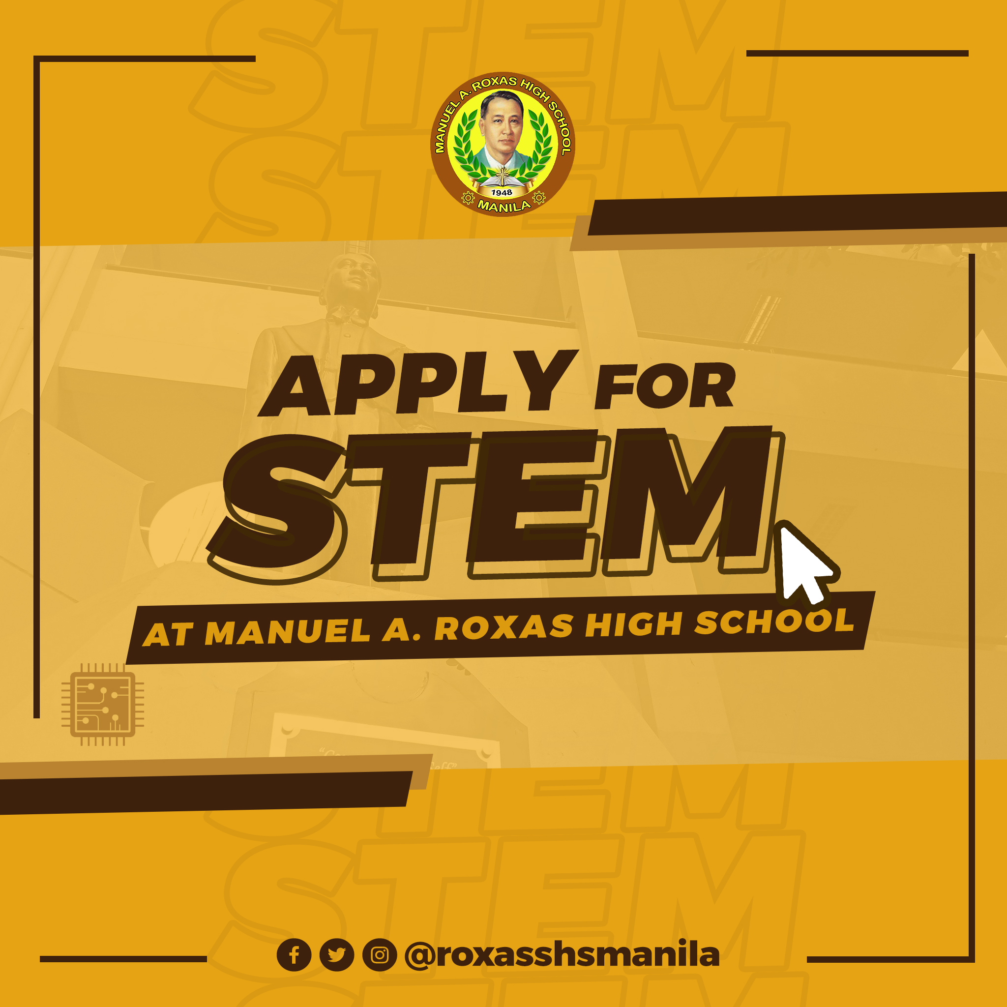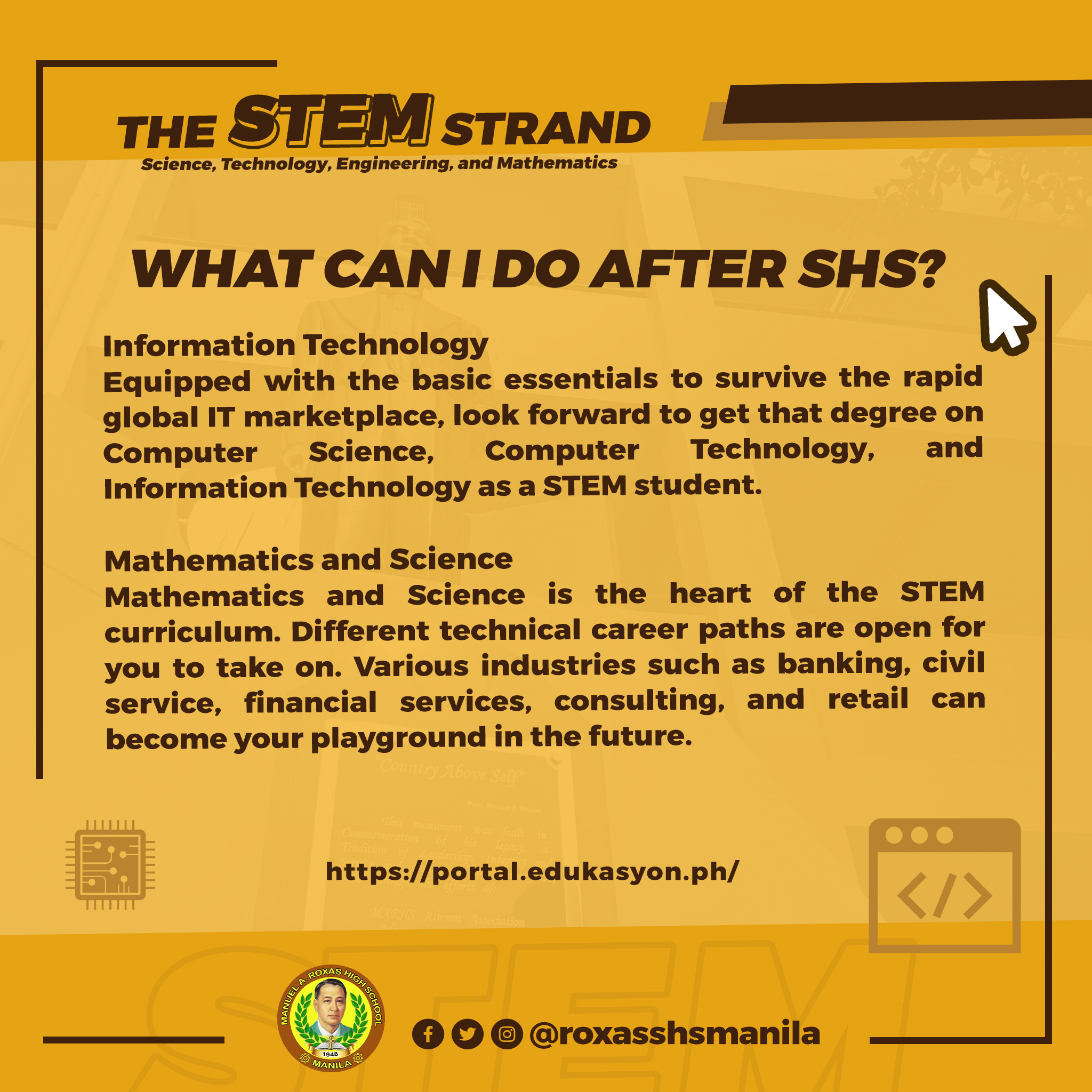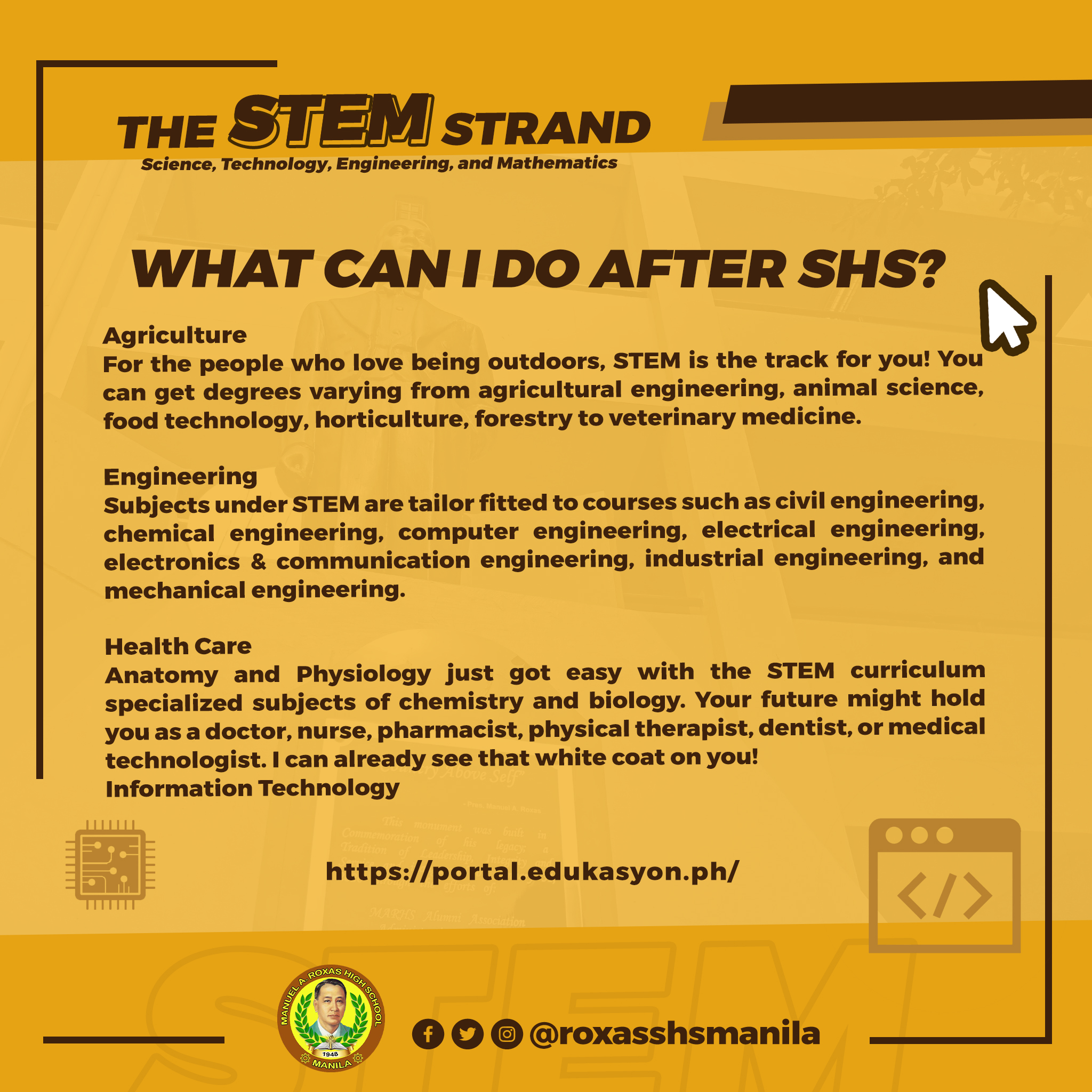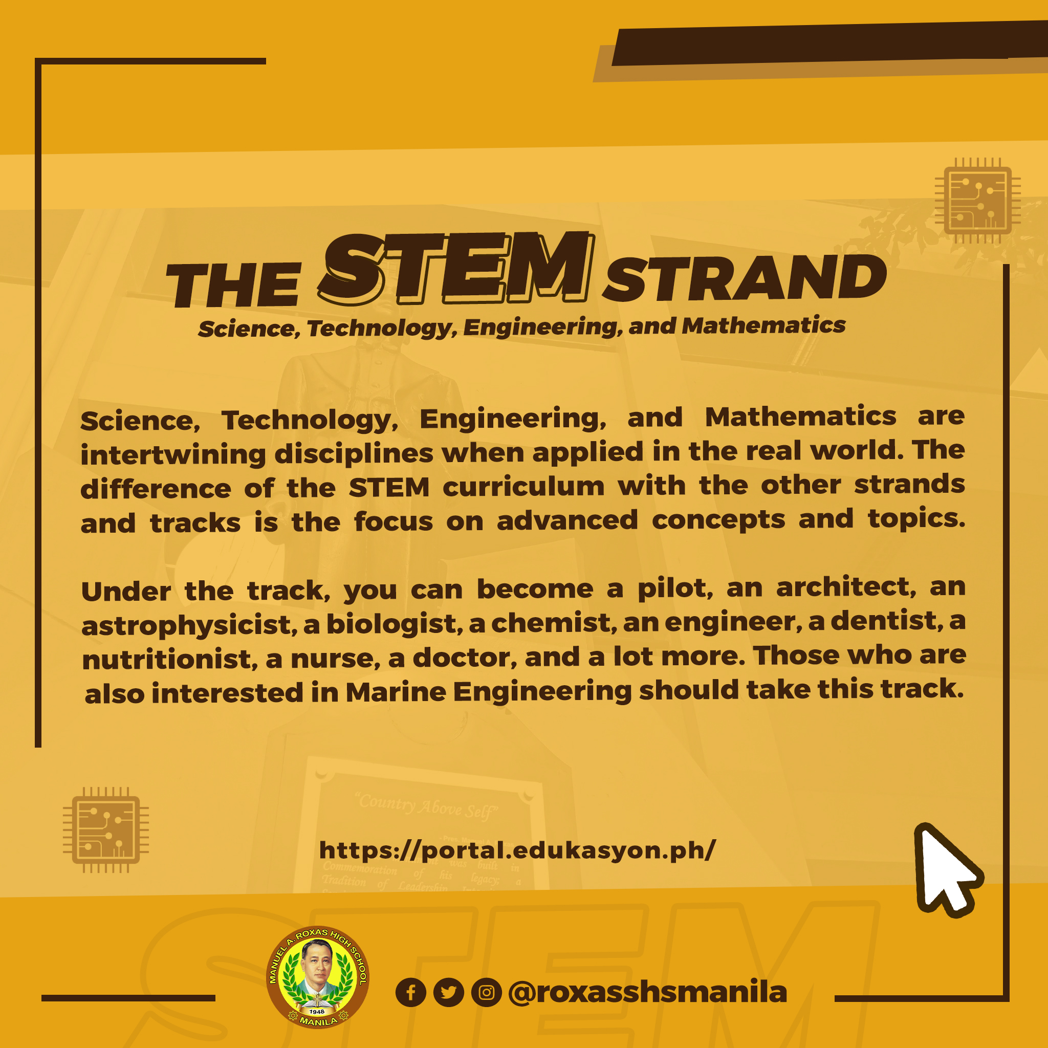 Are you interested in both Math and Science? Manuel A. Roxas High School offers you Science, Technology, Engineering and Mathematics (STEM) strand! Under this academic track, students learn to immerse and equip themselves with logical thought processing, problem-solving, analyzing errors, and having an in-depth understanding of the global economy in an interdisciplinary and applied approach. All the subjects that fall under its four disciplines—science, technology, engineering, and mathematics—eventually foster students' mathematical, scientific, and linguistic competence. It encompasses a variety of skills that are needed in different in-demand fields. Check out other information related to this strand by viewing the following pictures attached to this post. Enroll now and choose #STEM!